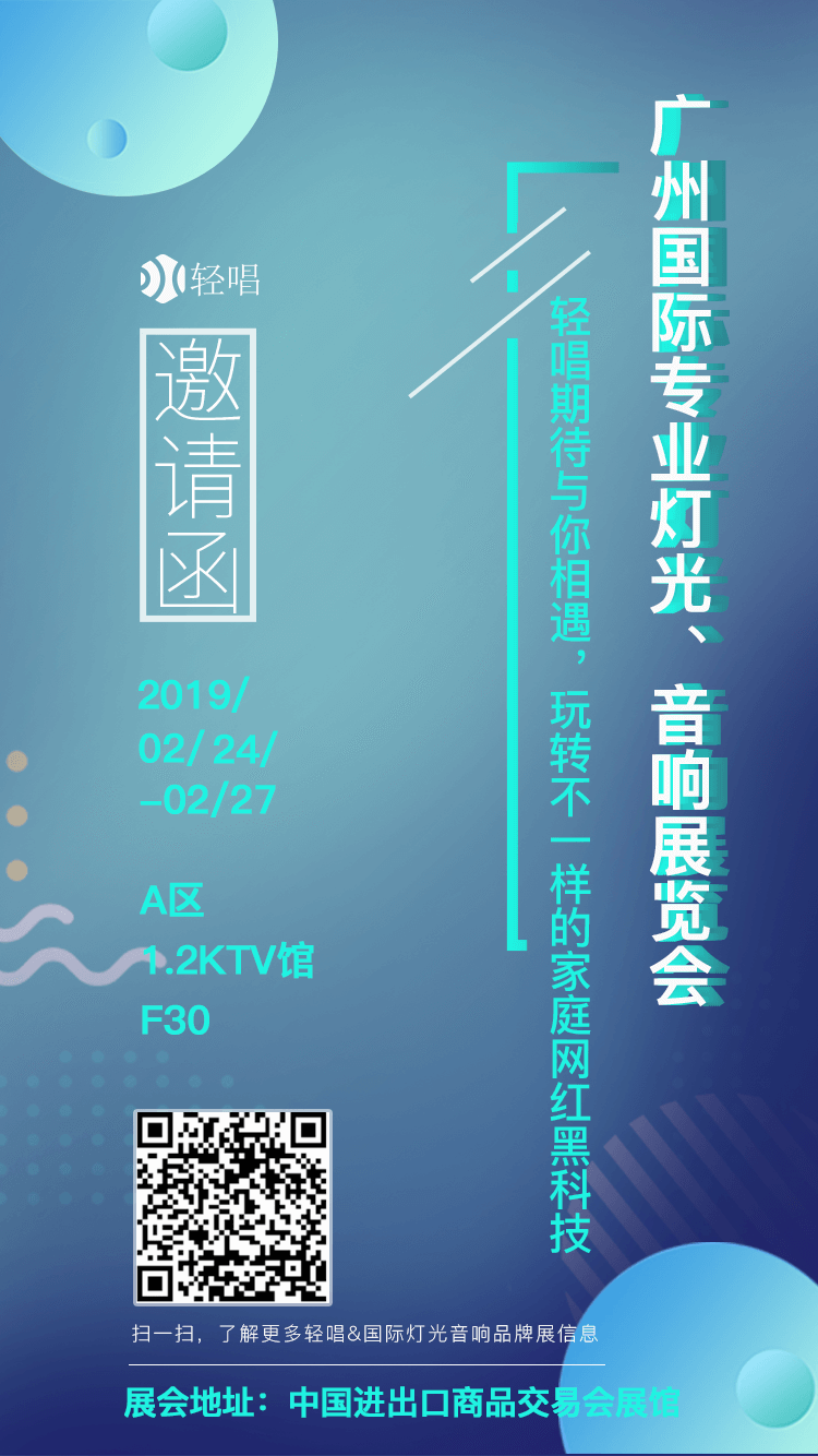 2019第十七届广州国际专业灯光、音响展览会,中国进出口商品交易会展馆A区1.2KTV馆F30展位,轻唱期待与你相遇。